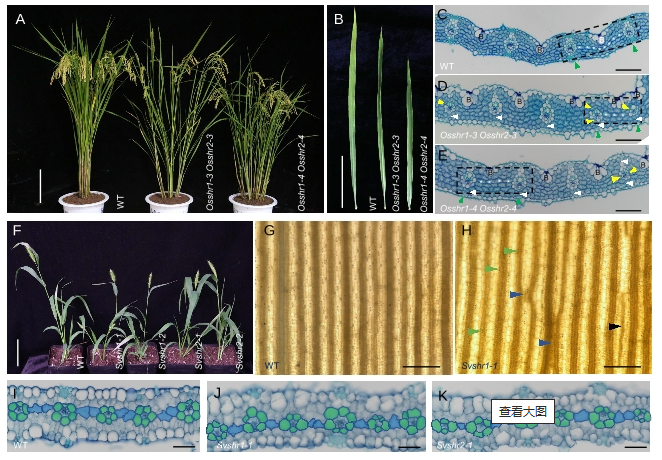C; and C, grasses directly and indirectly provide the vast majority of calories to the human diet, yet our understanding of themolecular mechanisms driving photosynthetic productivity in grasses is largely unexplored. Ground meristem cells divide toform mesophyll or vascular initial cels early in leaf development in C, and C, grasses.Here we dehine a genetic circuit composedof SHORT ROOT (SHR),INDETERMINATE DOMAIN (IDD), and PIN-FORMED (PIN) family members that specifes vascularidentify and ground cell proliferation in leaves of both C; and C grasses. Ectopic expression and loss-of-function mutant stud'jes of SHR paralogs in the C plant 0ryza sativa (rice) and the C, plant Setaria viridis (green millet) revealed the roles of thesegenes in both minor vein formation and ground cell diferentiation. Genetic and in vitro studies further suggested that SHRregulates this process through its interactions with lDD12 and 13. We also revealed direct interactions of these lDD proteinswith a putative regulatory element within the auxin transporter gene PlN5c. Collectively, these fndings indicate that a SHR-IDD regulatory circuit mediates auxin transport by negatively regulating PIN expression to modulate minor vein patterning inthe grasses.