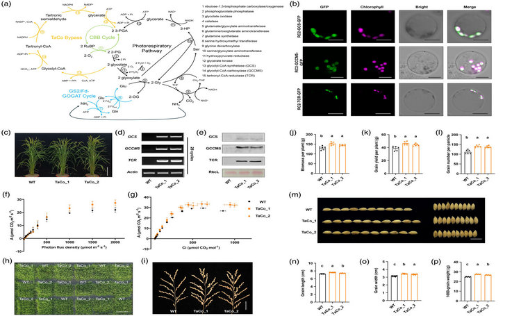 研究团队利用来自细菌的3个酶,即赤细菌的乙醇酰辅酶A合成酶(GCS)、甲基杆菌的乙醇酰辅酶A羧化酶(GCCM5)和橙色绿屈挠菌丙醇二酰辅酶A还原酶(TCR),经密码子优化、高效靶向肽融合及多基因??楣菇ǎ晒铣闪艘惶跞鹿夂粑月稵aCo路径,导入水稻后,TaCo路径在水稻叶绿体内可稳定表达,将乙醇酸转化为甘油酸,这一过程不仅减少能量消耗,还额外固定1分子CO2。田间试验表明,TaCo水稻生物量提升11.1%–17.2%,籽粒产量增加14.2%–20.2%;在高光、高CO2条件下表现出更高的净光合速率和羧化效率,CO2补偿点显著降低,明确具备“碳正性”效应。多组学分析发现,TaCo路径可增强碳水化合物代谢和细胞分裂素合成,有效促进籽粒发育。本研究合成了一条全新光呼吸旁路,实现了光呼吸由“负”(碳消耗)到“正”(碳固定)的转变,提升了作物光合作用的潜力,为培育高光效高产水稻新材料提供了新路径。