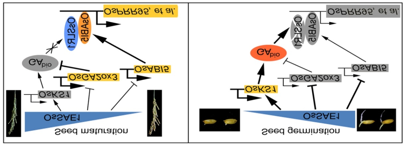 该研究发现,OsSAE1蛋白不仅能通过抑制脱落酸信号通路来促进水稻种子萌发,还直接调控赤霉素合成与代谢,通过精细平衡两大激素的水平调控种子萌发。
