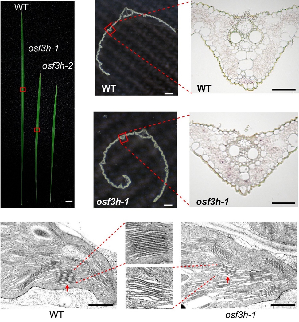 osf3h编辑功能缺失后表现为叶长缩短、维管变小、类囊体变稀疏表型。中国农科院供图